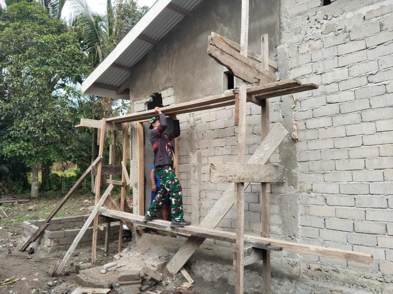 Personel Tentara Nasional Indonesia yang tergabung dalam Satgas TMMD bekerja sama dengan warga lokal dalam melaksanakan pengerjaan proyek ini. Fokus kegiatan saat ini adalah pada penyempurnaan struktur bangunan, pemasangan dinding, dan penataan interior rumah agar dapat segera dihuni.
