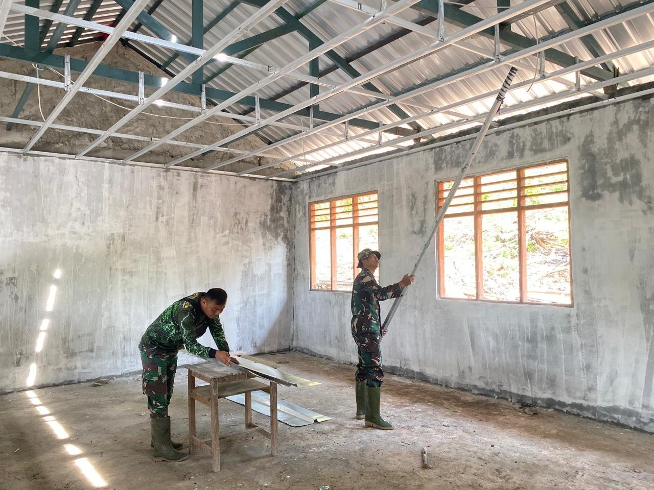 Pembangunan SDN Lanaus Makin Maju, Satgas TMMD Laksanakan Pengecatan Tiang Besi Kuda-Kuda