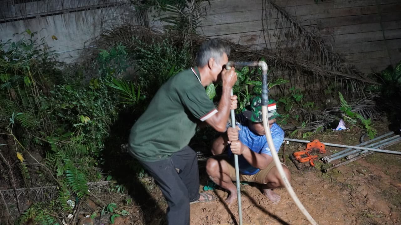 Proses pengerjaan sumur bor dilakukan secara gotong royong antara personel Satgas TMMD dan masyarakat setempat. Untuk mempercepat penyelesaian, pengerjaan pengeboran juga dilakukan hingga malam hari.