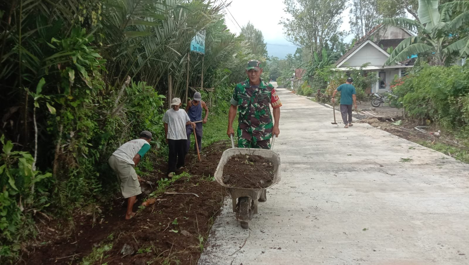 Lumajang, Upaya Kolaborasi, Babinsa Sidomulyo Koramil 0821-14/Pronojiwo, Serma Ikhwanurudin, bersama warga setempat, melaksanakan kerja bakti pembersihan drainase di sisi jalan Dusun Kebonsenin, RT 013/RW 006, Desa Sidomulyo, Kecamatan Pronojiwo Kabupaten Lumajang, Jawa Timur, pada Selasa (25/2/2025).