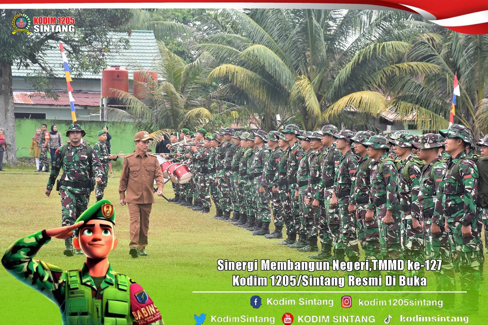 Sintang – Kodim 1205/Sintang secara resmi meluncurkan kegiatan TNI Manunggal Membangun Desa (TMMD) ke-127 dengan menggelar upacara pembukaan yang berlangsung dengan khidmat. Kegiatan ini juga mencakup penyaluran bantuan sosial kepada masyarakat sebagai wujud kepedulian TNI terhadap kesejahteraan warga setempat.
