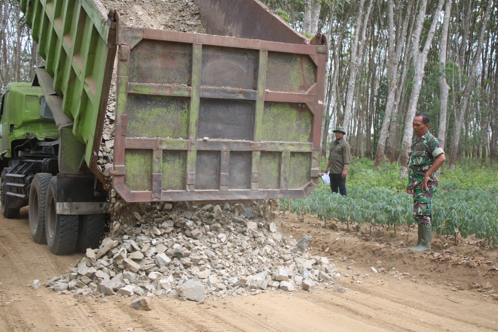 Tulang Bawang – Kegiatan fisik dalam program TMMD ke-125 Kodim 0426/Tulang Bawang di Kampung Moris Jaya, Kecamatan Banjar Agung, kini memasuki fase penting. Pengerasan badan jalan mulai dilaksanakan, ditandai dengan kedatangan material subbase tipe C yang diangkut menggunakan dump truck. Jumat (01/08/2025), material mulai diturunkan dan diratakan di ruas jalan yang telah dibuka sebelumnya.