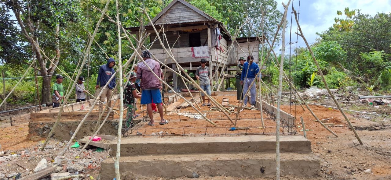 Bombana, Pembangunan Rumah Tidak Layak Huni (RTLH) milik Salmawati, warga Desa Wia-wia, Kecamatan Matausu, Kabupaten Bombana, Sulawesi Tenggara, kini memasuki tahap pemasangan slop dan tiang. Pengerjaan ini merupakan bagian dari program TNI Manunggal Membangun Desa (TMMD) ke-124. Sabtu, 10/05/2025.