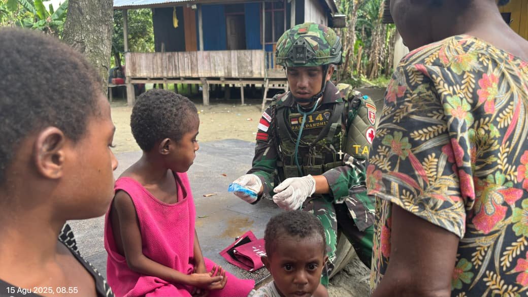 MAMBERAMO RAYA – Wujud kepedulian terhadap kesehatan masyarakat Papua, Satgas Yonif 614/RJP Pos Dabra melaksanakan pengobatan gratis di Desa Dabra, Distrik Mamberamo Hulu, Kabupaten Memberamo Raya, Papua. Jum’at (15/8/2025).