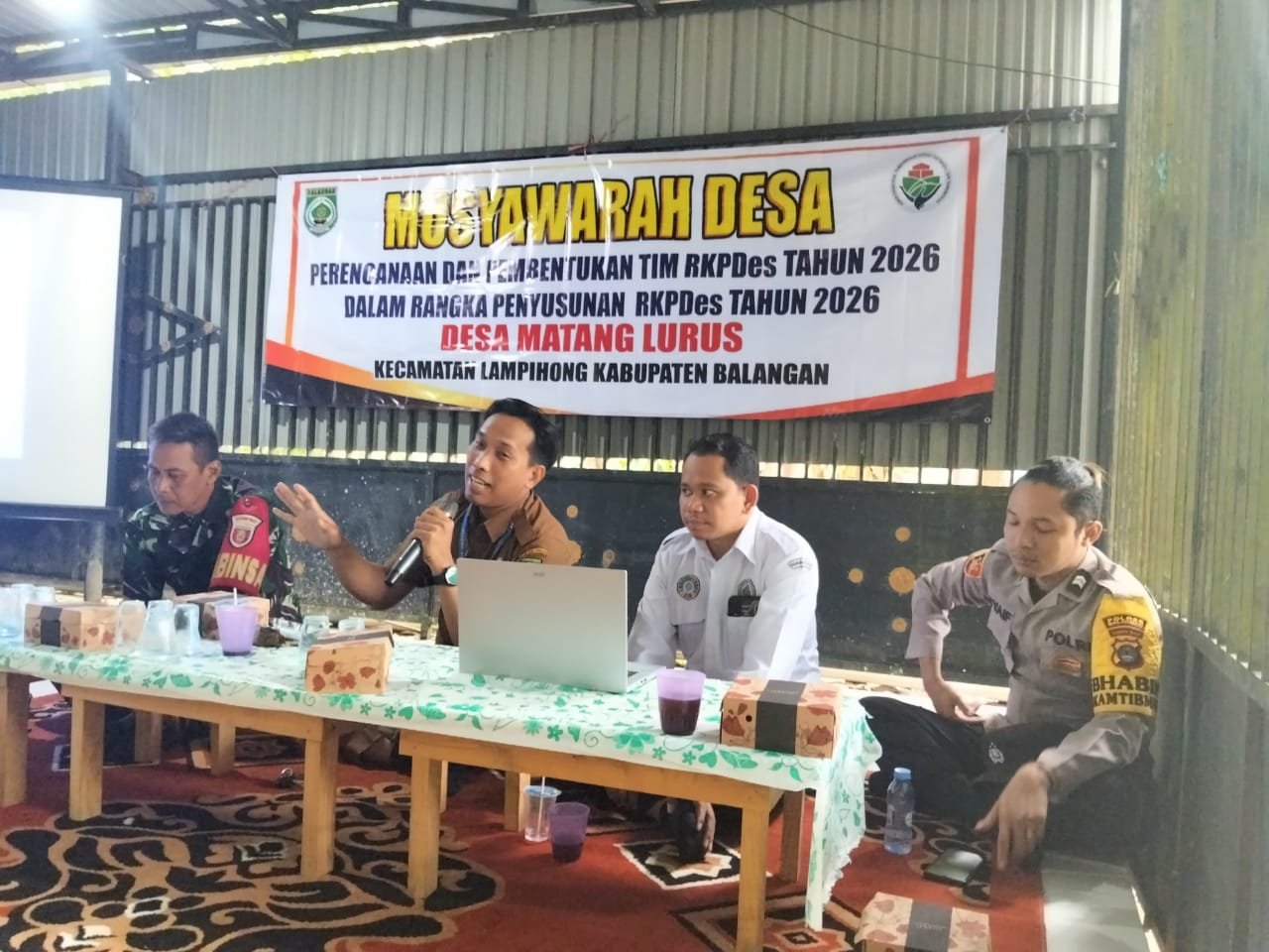 BALANGAN — Babinsa Desa Matang Lurus Koramil 1001‑05/Lampihong Kodim 1001/HSU‑BLG, Serka Muhammad Yamin, turut menghadiri Musyawarah Desa (Musdes) pembentukan Tim Penyusun Rencana Kerja Pemerintah Desa (RKPDes) Tahun Anggaran 2026 di Balai Desa Matang Lurus, Kecamatan Lampihong, Kabupaten Balangan. Senin (07/07/2025) pukul 10.30 WITA. Kegiatan berakhir pukul 11.30 WITA dalam keadaan aman, tertib, dan lancar.
