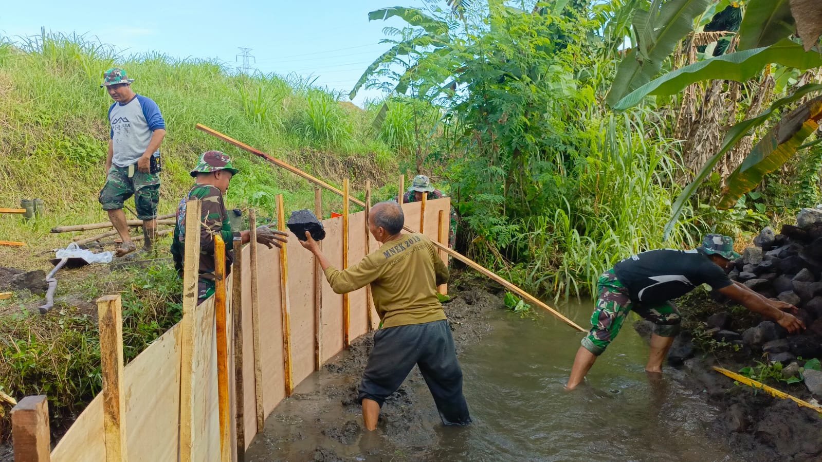 Untuk hari ini, pengerjaan kita awali dengan pembersihan lokasi yang dilanjutkan pengecoran senderan,”ucapnya.