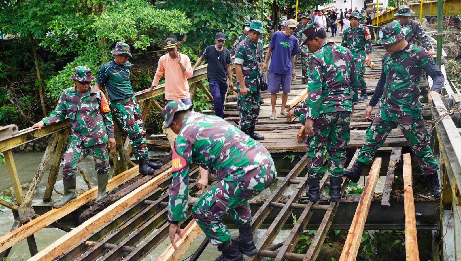 MOROWALI, Jumat 28 Februari 2025 – Satgas TNI Manunggal Membangun Desa (TMMD) Ke-123 Kodim 1311/Morowali bersama warga Desa Sakita bergotong royong memperbaiki jembatan yang menjadi salah satu sasaran fisik dalam program TMMD kali ini. Perbaikan ini disambut dengan penuh kebahagiaan oleh warga, terutama Ibu Samia, yang mengungkapkan rasa syukurnya atas upaya tersebut.