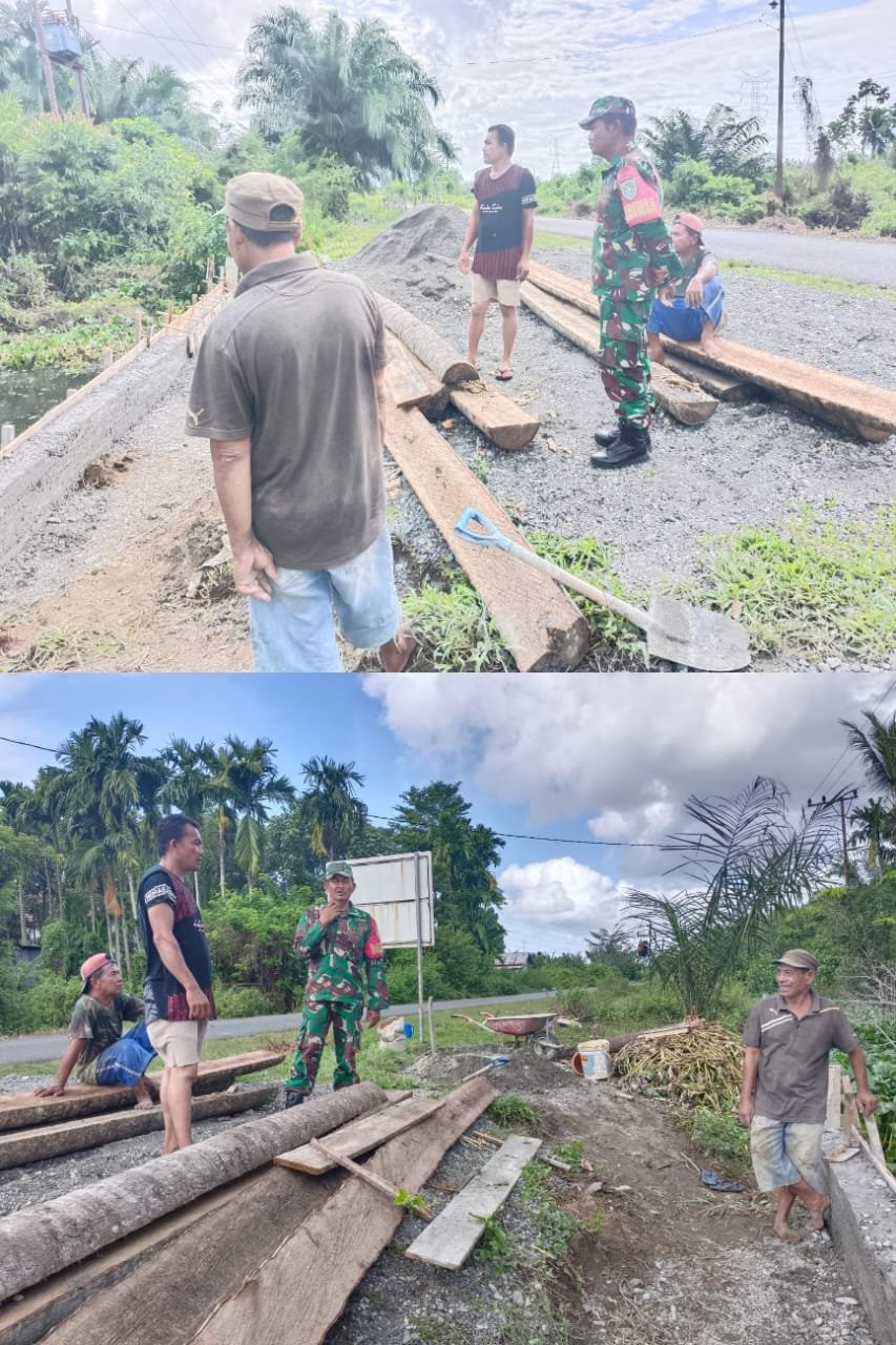 ACEH BARAT – Guna memperlancar dan mempermudah mengangkut hasil pertanian/perkebunan, Babinsa Koramil 04/Mrb Kodim 0105/Abar, Serma Ngadiso, bersama petani gotong royong saling bahu-membahu membangun akses jembatan menuju lahan pertanian di Desa Langung, Kecamatan Meureubo, Sabtu (10/1/2026).