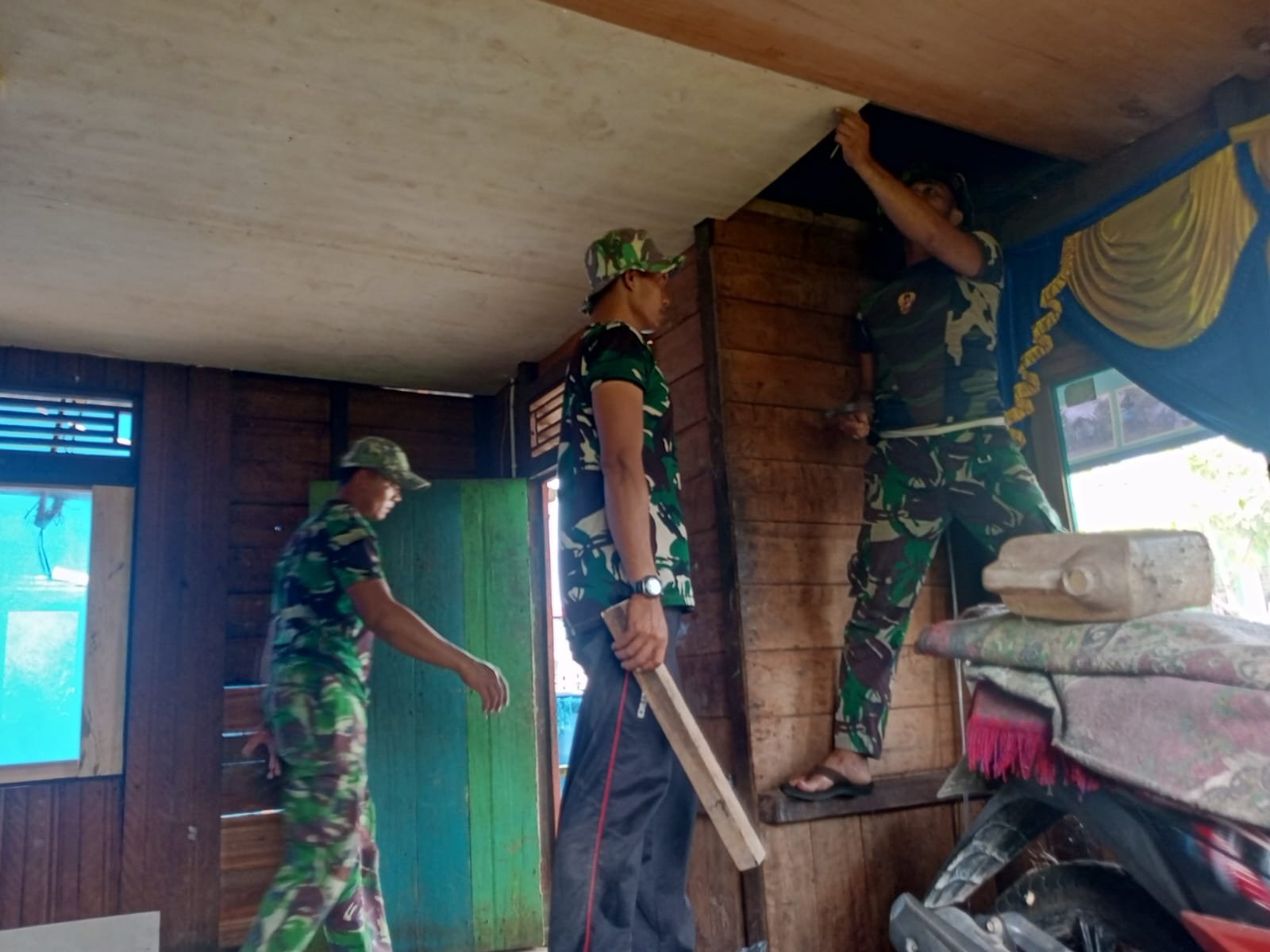 Pekerjaan pemasangan plafon itu merupakan salah satu kegiatan fisik yang dilakukan Satgas TMMD untuk meningkatkan kenyamanan dan keamanan tempat tinggal bagi warga setempat.