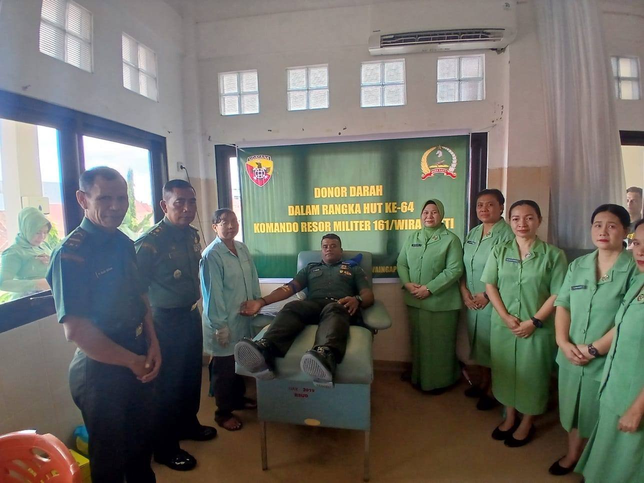 Komando Distrik Militer 1601/Sumba Timur menggelar Donor Darah Dalam rangka memperingati Hari Ulang Tahun (HUT) Korem 161/Wira Sakti ke-64 dan HUT Persit ke-79, yang melibatkan seluru Prajurit Kodim 1601/Sumba Timur Persit KCK Cabang XII Dim 1601 bertempat di Ruang Donor Rumah Sakit Umum Daerah Waingapu, Kelurahan Kambajawa, Kecamatan Kota Waingapu, Kabupaten Sumba Timur. Rabu (12/02/2025)