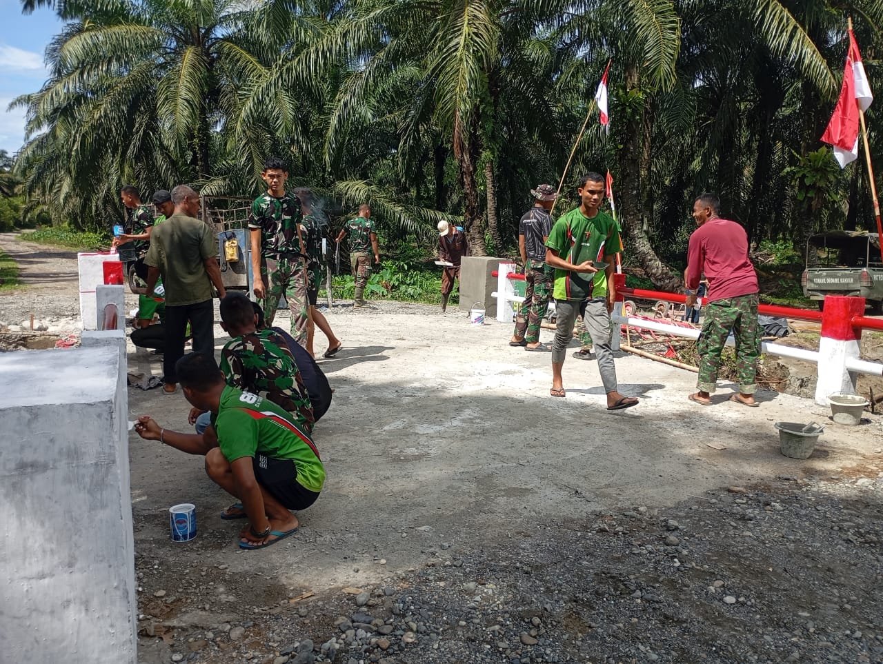 Anggota Posramil Tripa Makmur Kodim 0116/Nagan Raya, yang dipimpin oleh Peltu I Putu Bisma bersama sembilan orang personel serta masyarakat setempat melaksanakan kegiatan tahap akhir berupa pengecatan (finishing) tembok dan tiang pembatas Jembatan Aramco di Desa Kuala Tripa, Kecamatan Tripa Makmur, Kabupaten Nagan Raya, Kamis (23/04/2026).