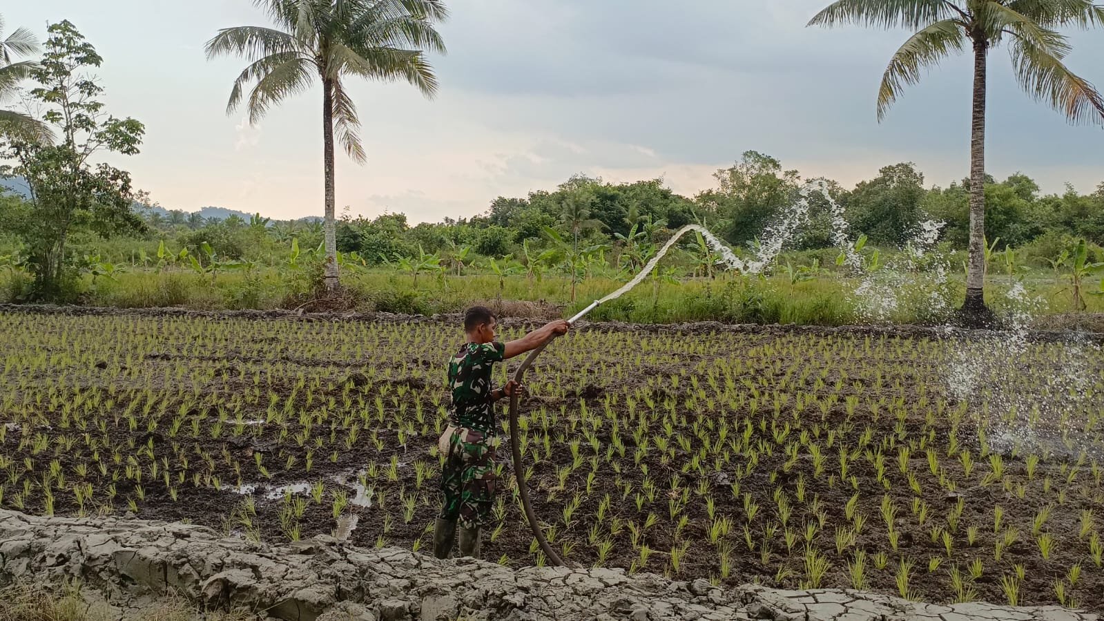Mempawah — Dalam semangat kemanunggalan TNI dan rakyat, personel Satgas TMMD Reguler ke-124 kembali menunjukkan kepeduliannya terhadap masyarakat dengan turut serta membantu para petani menyiram tanaman padi di sawah wilayah Desa Purun Kecil, Kecamatan Sungai Pinyuh, Kabupaten Mempawah.