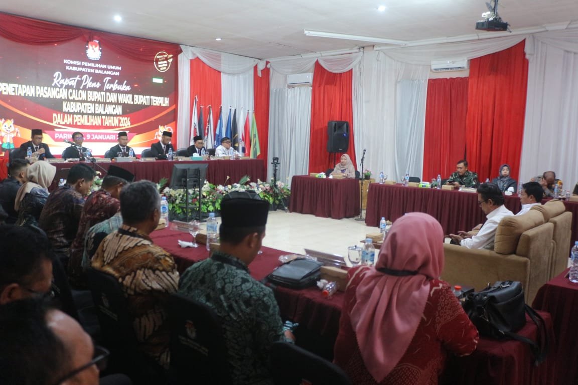 Acara rapat pleno terbuka penetapan pasangan calon Bupati dan wakil Bupati terpilih Kabupaten Balangan dalam pemilihan TA 2024 dipimpin oleh Ketua KPU Balangan Ahmad Turjani. S.Sos.i.