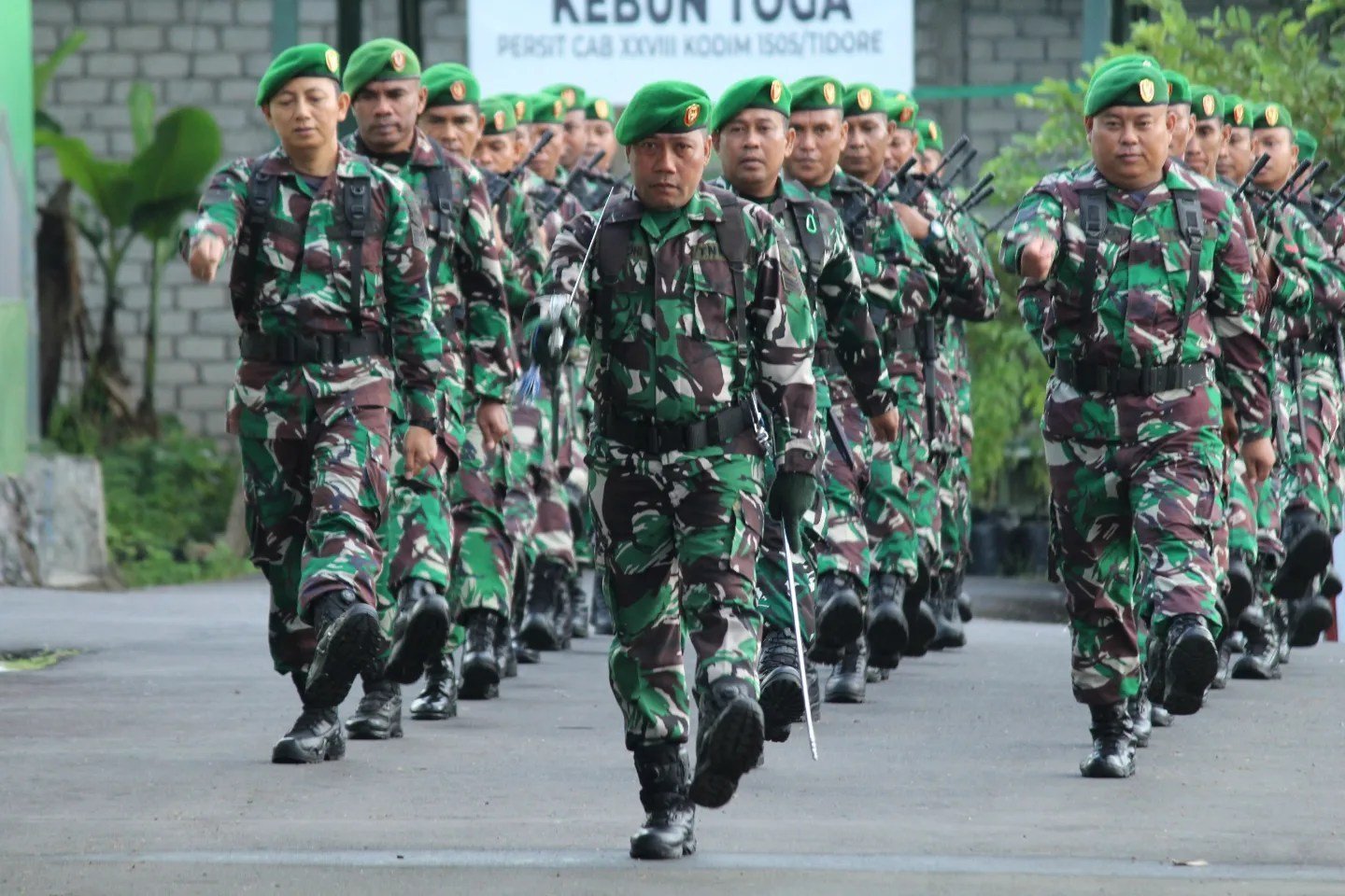 Tidore, Maluku Utara – Para prajurit Kodim 1505/Tidore melaksanakan latihan defile usai mengikuti upacara bendera di lapangan Makodim 1505/Tidore, Senin (6/1/2025). Kegiatan ini bertujuan untuk meningkatkan kedisiplinan dan kekompakan dalam melaksanakan gerakan baris-berbaris.