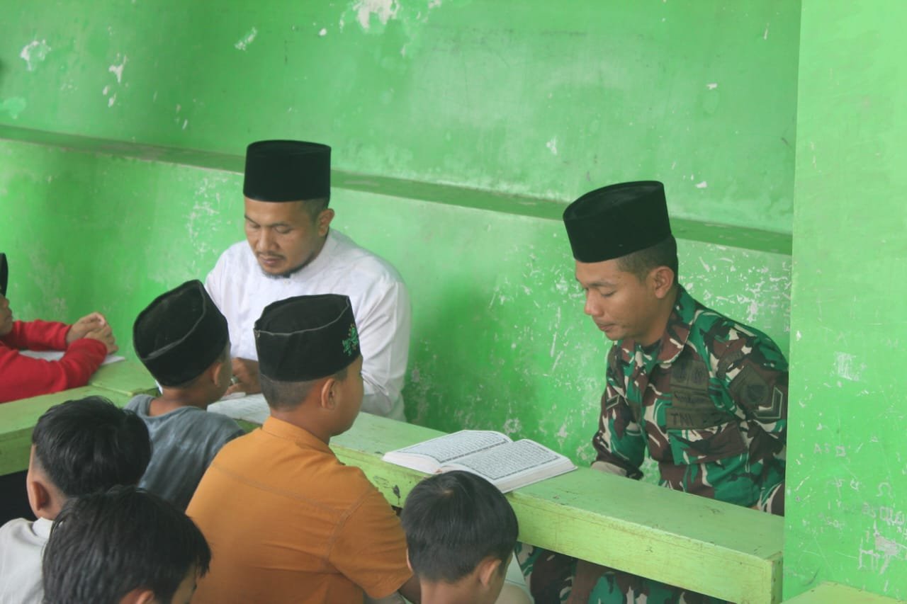 Serda Khairul M terlihat duduk bersila di antara para santri, dengan sabar membimbing mereka dalam membaca huruf-huruf hijaiyah. Suasana pembelajaran terasa hangat dan akrab. Kehadiran prajurit berpakaian loreng di tengah anak-anak tersebut memberikan semangat baru, terutama menjelang bulan suci Ramadhan.