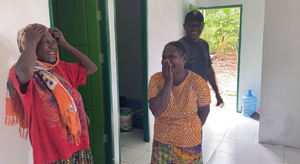 Kebahagiaan terlihat di wajah Ibu Evelina Surawi saat melihat rumah barunya yang hampir selesai. Rasa syukur dan kebahagian Ibu Evelina memberikan semangat tambahan bagi tim Satgas untuk segera menyelesaikan proyek ini.