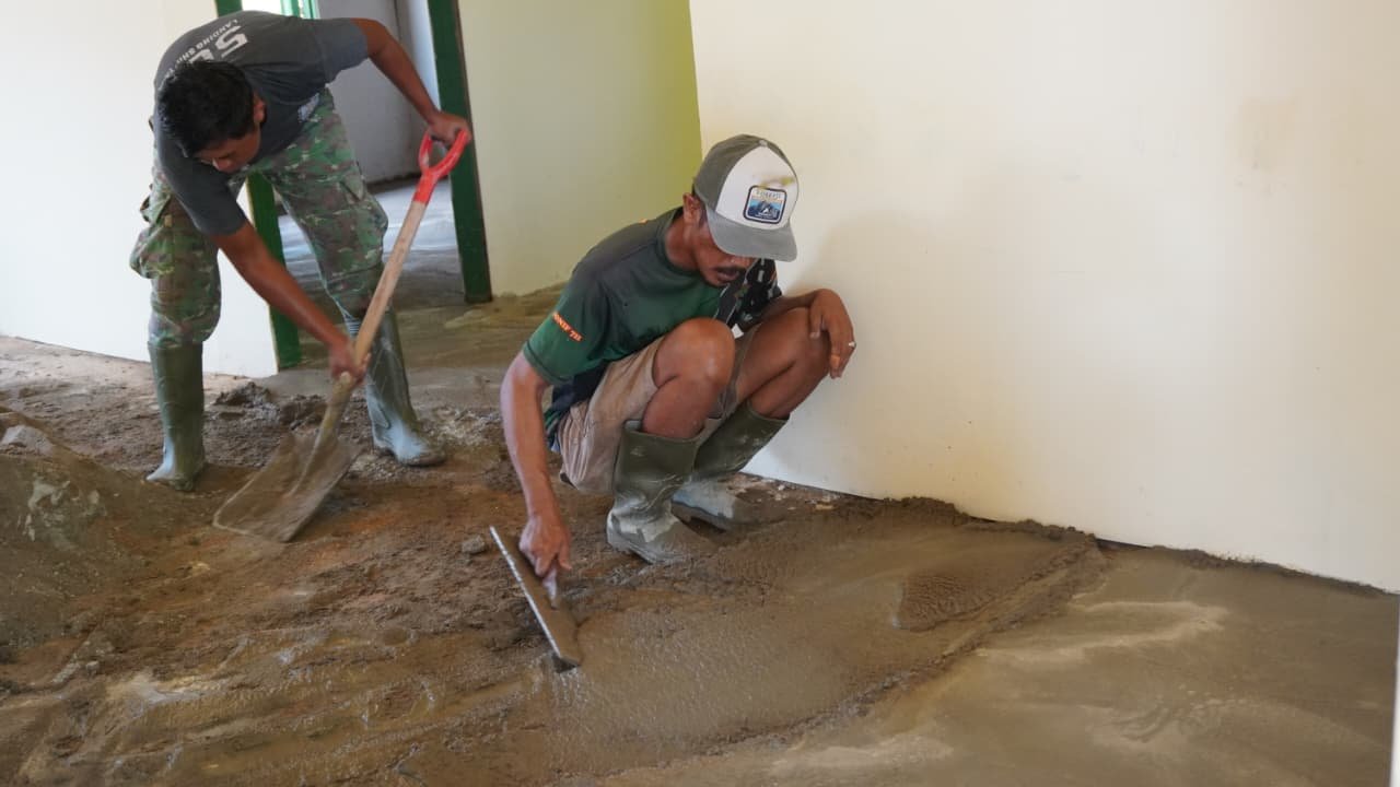 Anggota Satgas TMMD terlihat bekerja dengan penuh perhatian saat meratakan campuran semen di seluruh bagian lantai. Mereka memastikan setiap sudut terperhatikan agar tidak ada bagian yang bergelombang, sehingga kualitas bangunan dapat terjaga dengan baik.