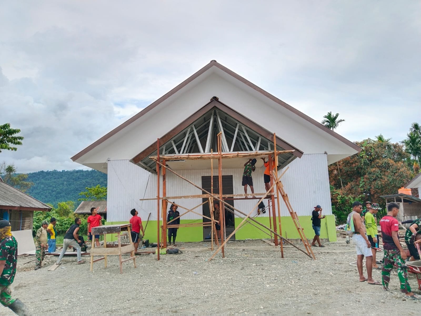 “Pengerjaan kami fokuskan pada percepatan tahap akhir, sehingga target penyelesaian dapat tercapai sesuai jadwal. Kami optimis gereja ini bisa segera digunakan oleh jemaat,” ujar salah satu anggota Satgas TMMD di lokasi.