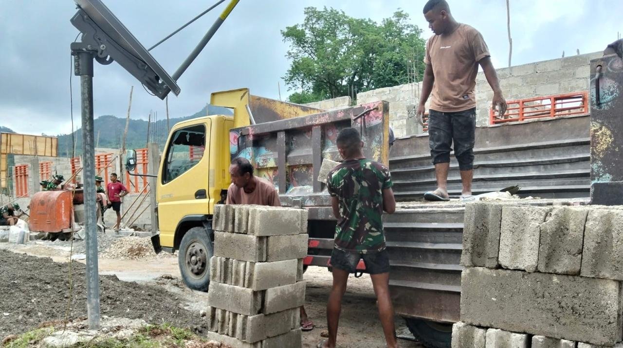 Pengiriman bahan bangunan seperti semen, besi, dan batu batako yang tiba di lokasi proyek menandakan bahwa progres konstruksi berjalan sesuai dengan tahapan yang direncanakan. Selain mengawasi, personel Satgas juga terlibat langsung dalam membantu proses bongkar muat material untuk memastikan efisiensi serta mempercepat pekerjaan.
