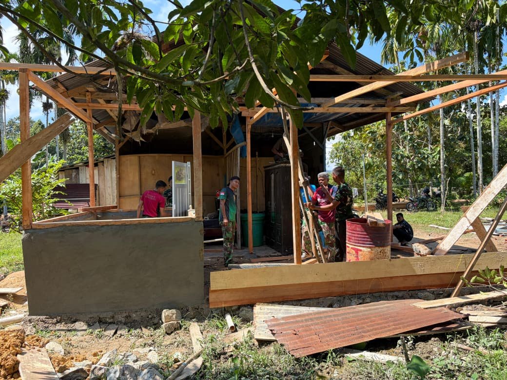 KONAWE UTARA – Pembangunan Rumah Tidak Layak Huni (RTLH) yang menjadi target pertama pada TNI Manunggal Membangun Desa (TMMD) ke-128 Kodim 1430/Konawe Utara menunjukkan kemajuan yang signifikan. Pada Kamis (30/4/2026), proses pemasangan papan semi permanen telah dimulai, sehingga bentuk rumah mulai nampak dengan jelas.