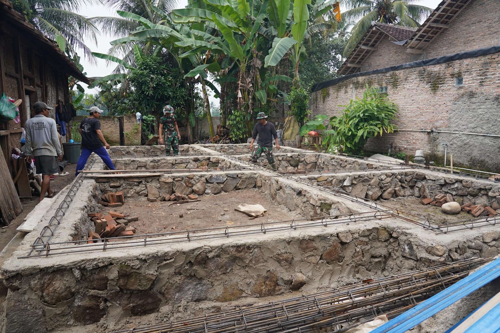 Personel Satgas TMMD bersama warga setempat melaksanakan pemasangan sloof secara bergotong royong. Tahapan ini sangat krusial dalam proses pembangunan karena sloof berfungsi sebagai pengikat pondasi dan penopang dinding rumah agar lebih kuat dan kokoh.