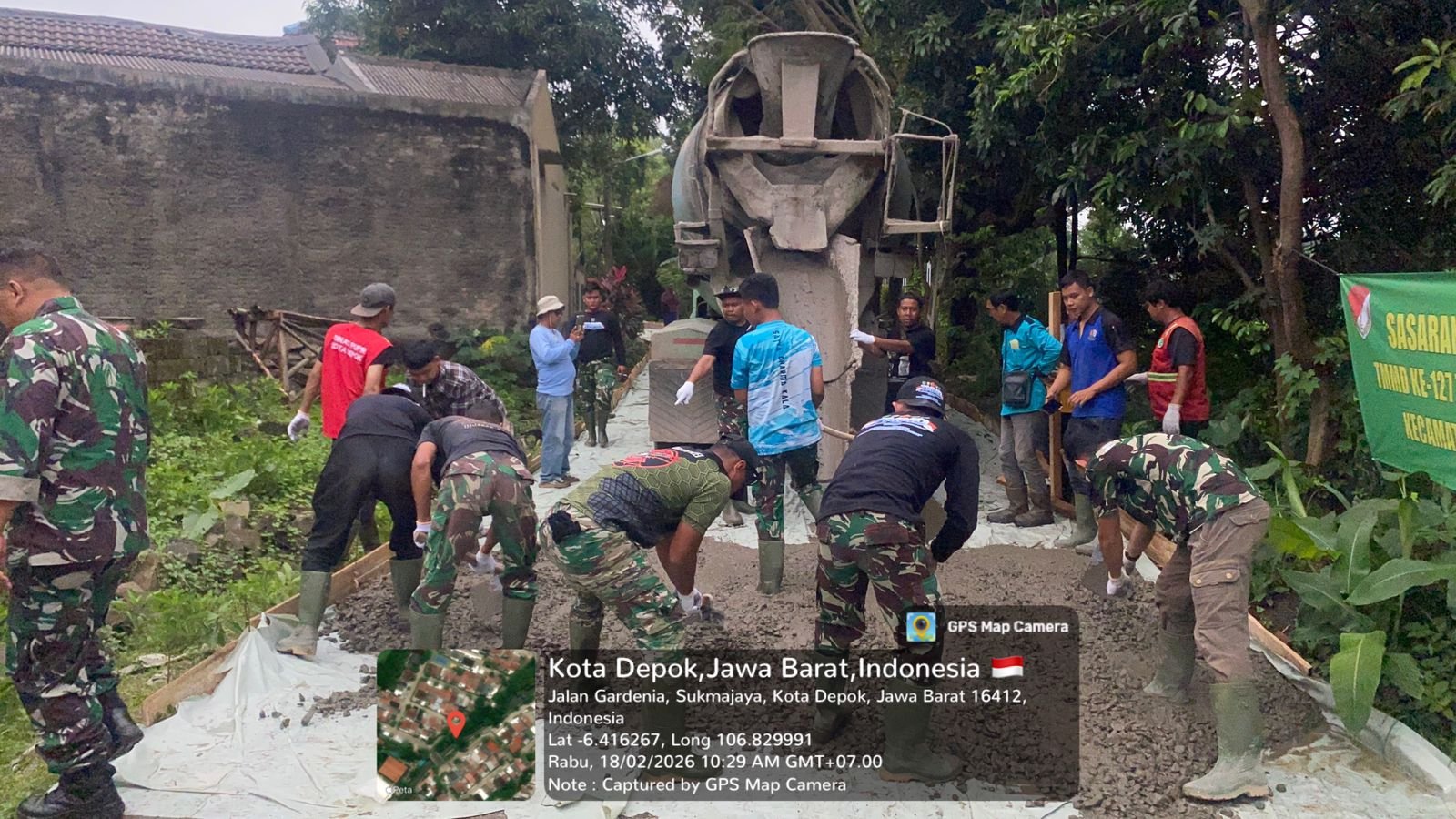 Depok – Pelaksanaan Program TNI Manunggal Membangun Desa (TMMD) Ke-127 Tahun Anggaran 2026 yang diadakan oleh Kodim 0508/Depok telah memasuki hari kedelapan pada Rabu, 18 Februari 2026. Progres pengerasan jalan di kawasan GDC Sektor Gardenia, tepatnya di Blok Q RT 03/07, Kelurahan Tirtajaya, Kecamatan Sukmajaya, Kota Depok, menunjukkan kemajuan yang cukup signifikan, dengan pencapaian pembangunan mencapai 40 persen.