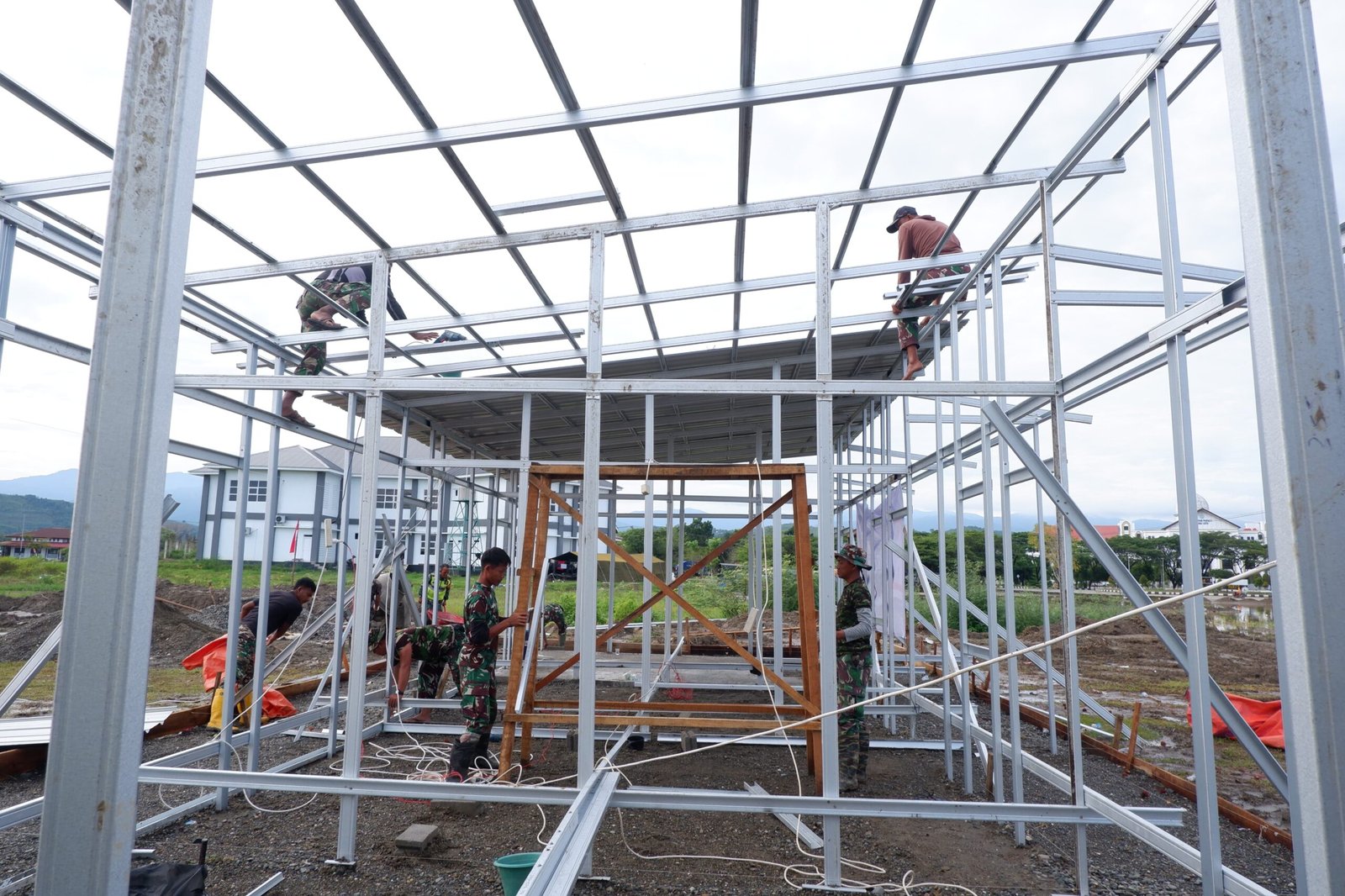 Pembangunan Huntara ini bertujuan untuk menyediakan tempat tinggal sementara yang layak dan aman bagi para korban bencana, selama proses perpindahan menuju hunian tetap (Huntap) yang lebih permanen. Strukturnya menggunakan rangka baja ringan dengan material papan semen serta dilengkapi fasilitas penting seperti dapur umum, sanitasi, dan tempat ibadah.