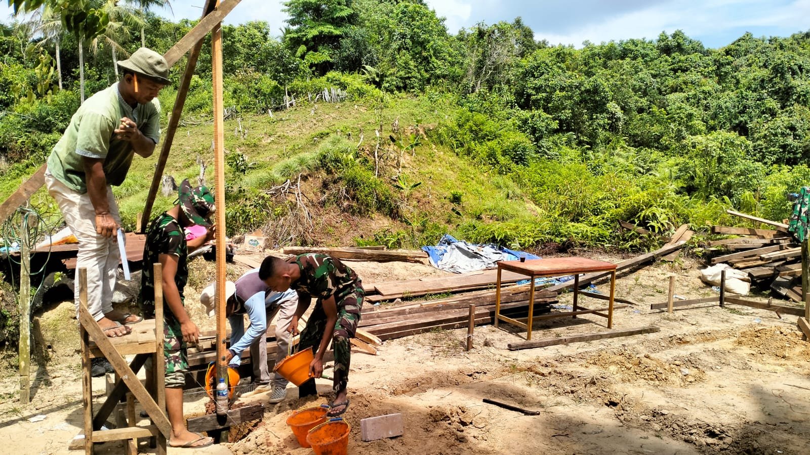 “Pengecoran tiang bangunan merupakan proses yang perlu pemikiran dan keahlian ekstra,” ujar Lettu Arh Suhendri saat berada di lokasi pengerjaan perehaban Rumah Tidak Layak Huni (RTLH) milik Bapak Rahman di Desa Suka Rahmat, Kecamatan Teluk Pandan, pada Selasa (29/07/2025).