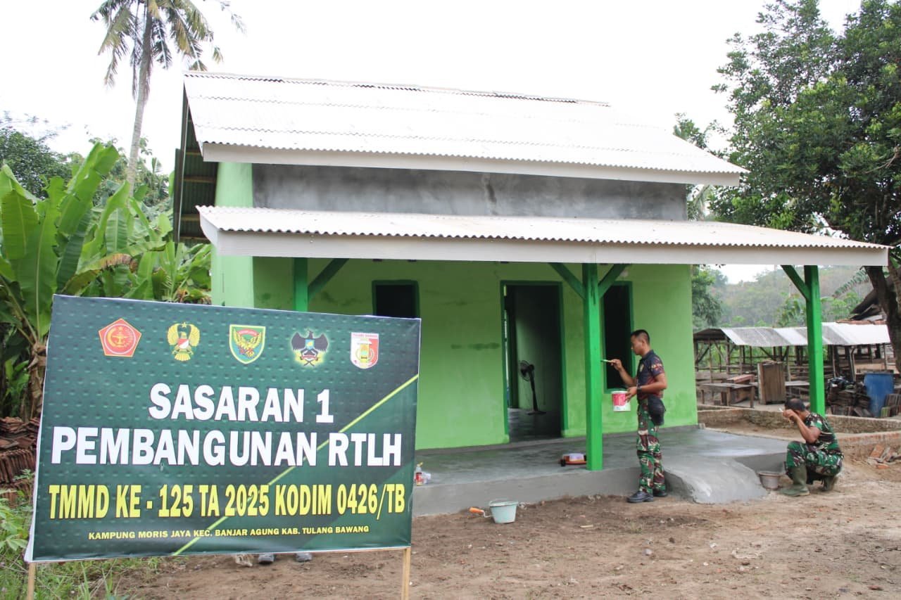 Tulang Bawang – Pengerjaan Rumah Tidak Layak Huni (RTLH) sasaran 1 dalam program TMMD Reguler ke-125 Kodim 0426/Tulang Bawang di Kampung Moris Jaya, Kecamatan Banjar Agung, terus menunjukkan perkembangan signifikan. Hingga Selasa (12/8/2025), progresnya telah mencapai sekitar 85 persen.