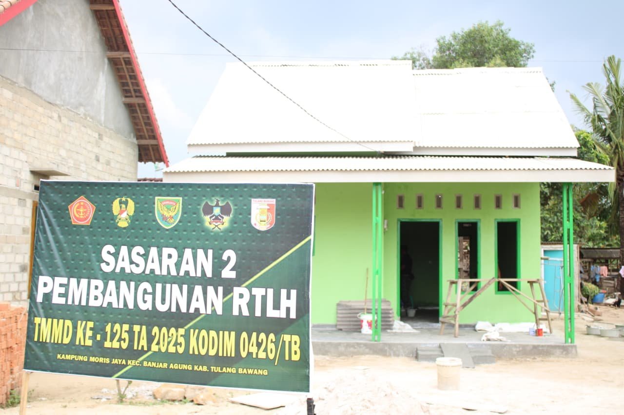 Tulang Bawang, 13 Agustus 2025 – Pengerjaan Rehabilitasi Rumah Tidak Layak Huni (RTLH) sasaran 2 yang menjadi salah satu fokus Program TNI Manunggal Membangun Desa (TMMD) ke-125 Kodim 0426/Tulang Bawang di Kampung Moris Jaya, Kecamatan Banjar Agung, hampir rampung dengan progres mencapai 95 persen.