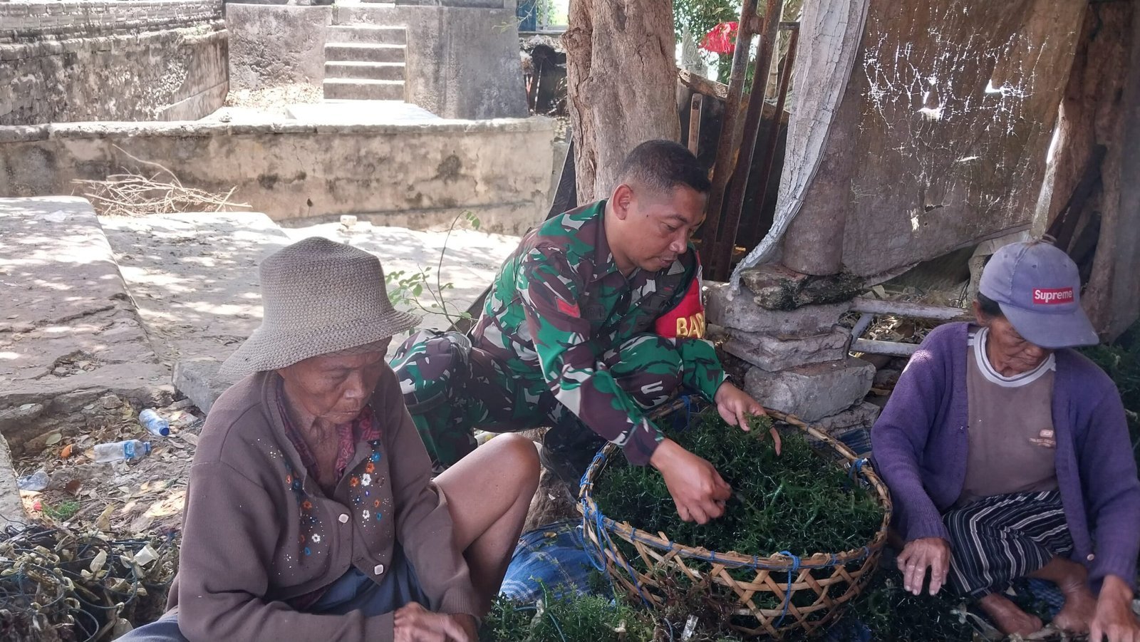 Dalam pendampingannya kali ini, Babinsa Koptu Kuswara sekaligus membantu para petani membersihkan hama lumut yang menempel di rumput laut.