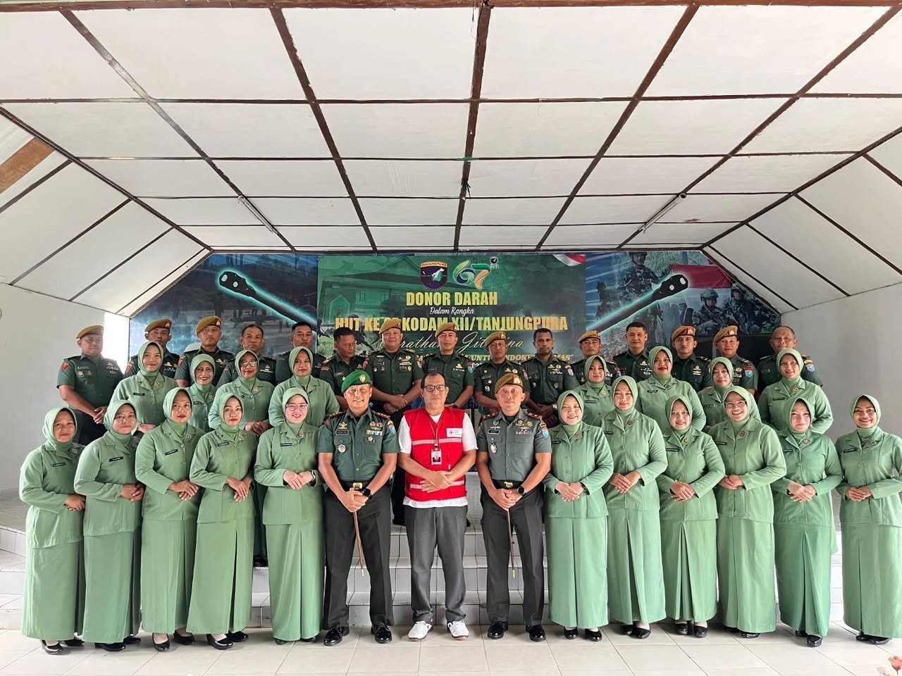 Landak – Dalam Rangka HUT Ke-67 Kodam VII/Tanjungpura Kodim 1210/Landak dan Yon Armed 16 /Tombak Kaputing mengelar Donor Darah .Kegiatan donor darah berlangsung di Batalyon Yon Armed 16/Tombak Kaputing. Kecamatan Ngabang, Kabupaten Landak Senin (14/7/2025)