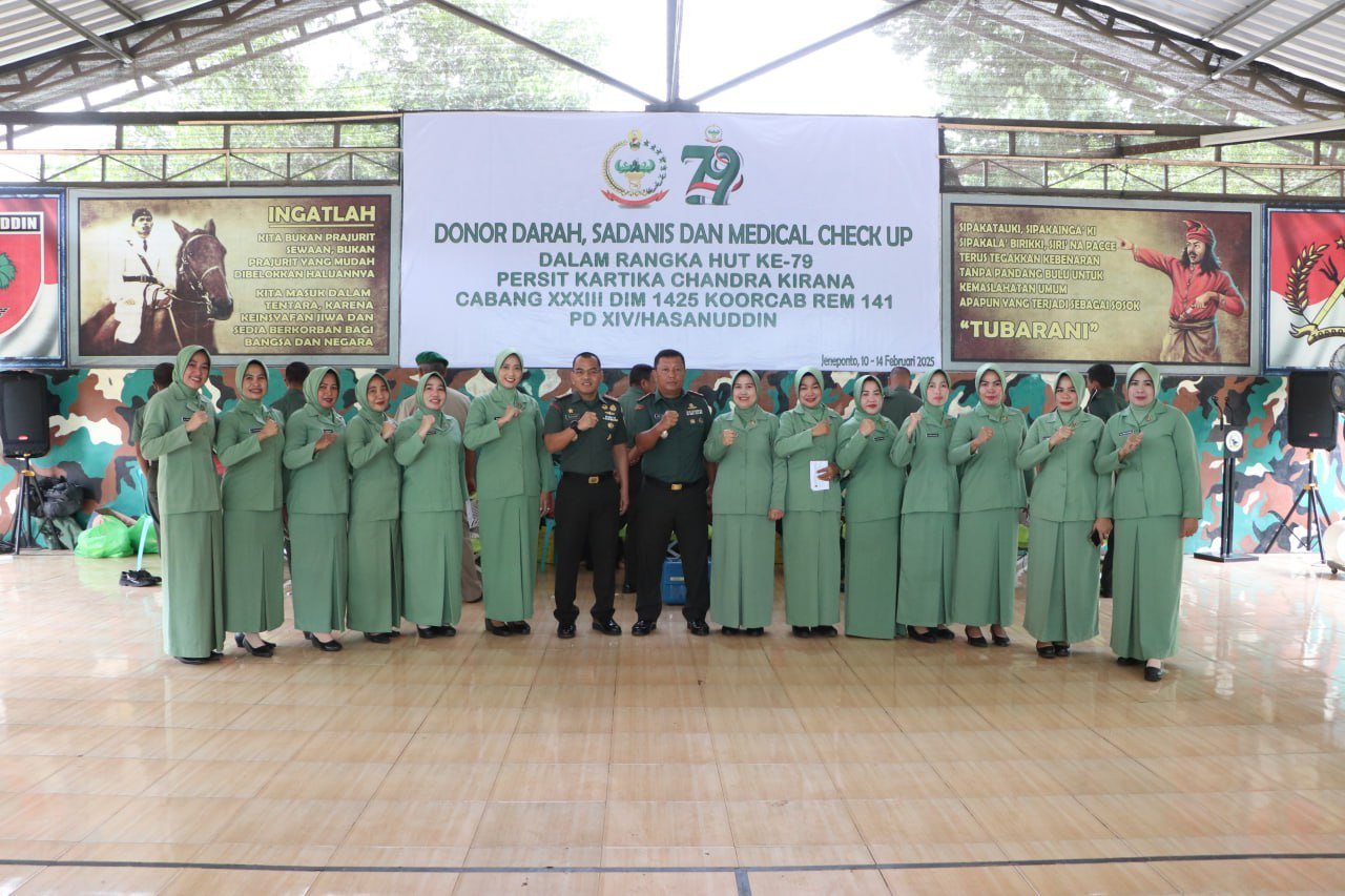JENEPONTO – Persit Kartika Candra Kirana (KCK) Cabang XXIII Kodim 1425 Jeneponto menggelar berbagai kegiatan sosial meliputi Donor Darah, Sadanis dan Medical Check Up yang digelar di Aula Markas Kodim 1425 Jeneponto Jl Lanto Dg Pasewang Kelurahan Balang Kecamatan Binamu Kabupaten Jeneponto, Selasa (11/02/25).