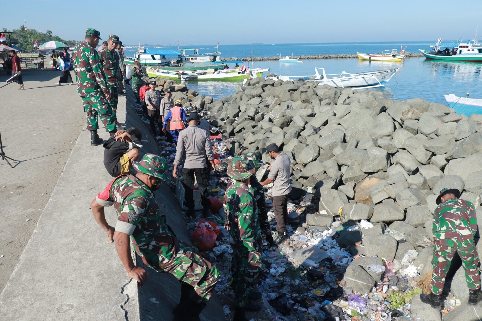 Sejumlah personel TNI Polri dari Kodim 1426/Takalar dan Polres Takalar Utara bersama instansi terkait dan warga setempat dengan semangat kerja bakti pembersihan Pelelangan Ikan Beba, termasuk saluran drainase yang mulai tersumbat akibat endapan lumpur dan sampah.