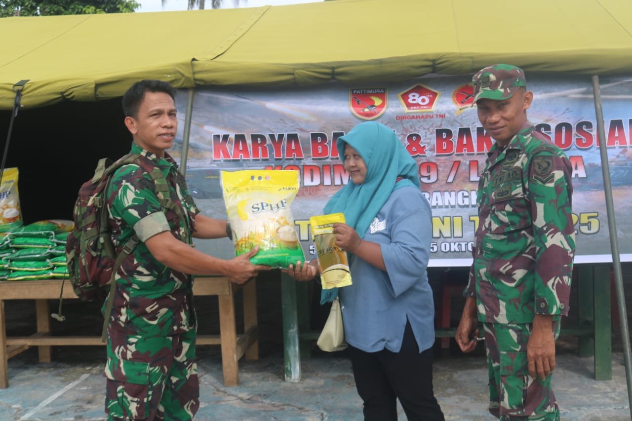 Bakti Sosial Pemberian Santuan di Serahkan langsung oleh Kasdim 1509/Labuha Mayor Inf Muhammad Ikbal dan Pasiter Lettu Inf Lukito, paket bantuan sosial disediakan Oleh Kodim 1509/Labuha sebanyak 20 Paket yang terdiri berbagai bahan sembako.