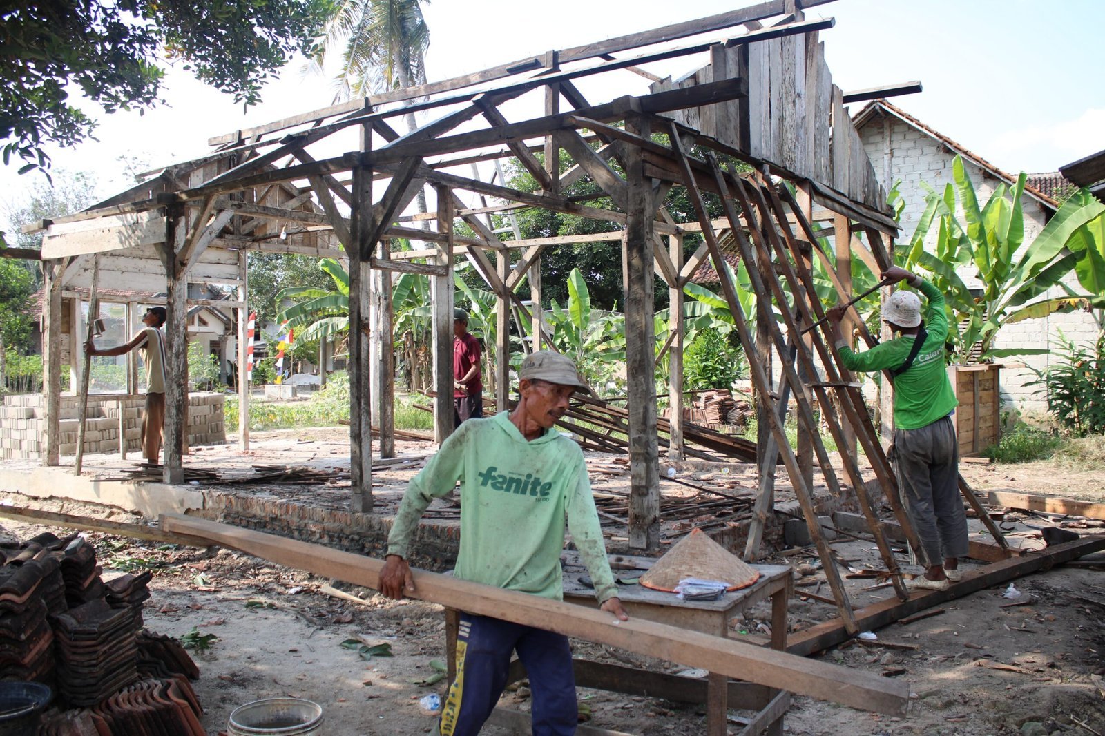 Proses pembongkaran dilakukan secara gotong royong dengan bantuan warga sekitar. Material bekas yang masih layak seperti kayu dan seng dipilah untuk dimanfaatkan kembali sesuai kebutuhan.
