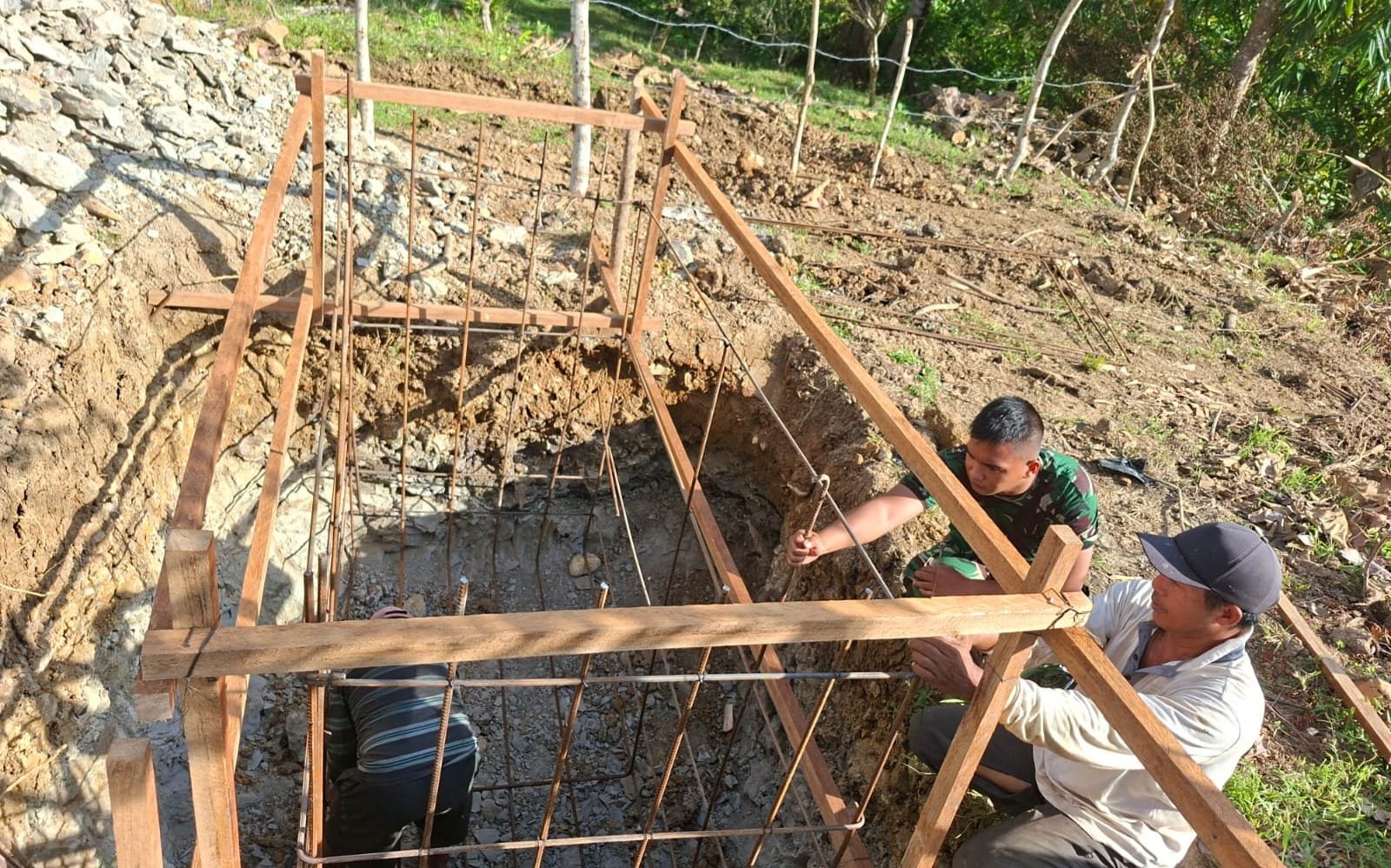 Dalam proses pembangunan pembesian abotmen dan pengangkutan material batu untuk pondasi jembatan gantung, terlihat jelas keterlibatan Babinsa yang berbaur dengan warga dan ikut serta dalam berbagai pekerjaan fisik.