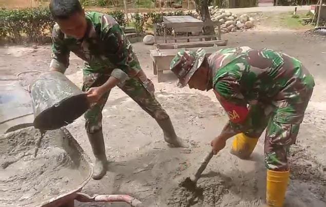 Kegiatan ini menandai tahapan finishing bagian struktur bawah rumah. Perapian dilakukan dengan menggunakan alat manual, cangkul, serta penggaris air untuk memastikan permukaan lantai benar-benar rata dan tidak mudah retak saat dicor nanti. Anggota Satgas TMMD bekerja bahu-membahu bersama warga, mempercepat proses dengan tetap mengedepankan ketelitian dan kualitas kerja.