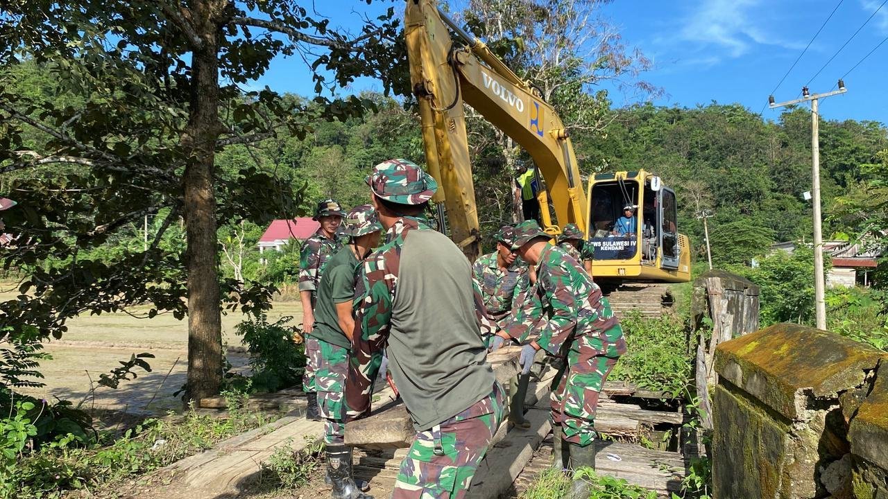 Pembongkaran dilakukan menggunakan alat berat di bawah pengawasan langsung Komandan Satuan Setingkat Peleton (Dan SST), Lettu Inf Iswari. Jembatan lama yang sebelumnya menjadi akses utama masyarakat telah mengalami kerusakan berat dan dinilai membahayakan keselamatan pengguna.