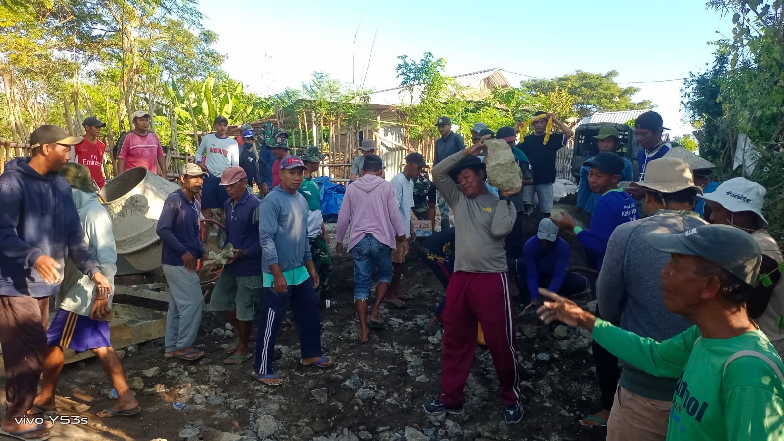 Satgas dan warga saling bahu membahu mengangkut material seperti batu, pasir, dan semen ke lokasi pembangunan. Mereka juga bekerja sama dalam proses pemasangan rangka serta pengecoran bagian dasar jembatan.