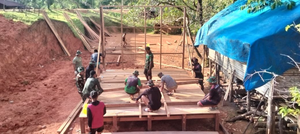 Menurut Yosep, salah satu warga yang ikut membantu Satgas TMMD, tahap pengerjaan kini telah masuk pada pemasangan tiang utama dan rangka atap, yang kemudian akan dilanjutkan dengan pemasangan atap secara bertahap.