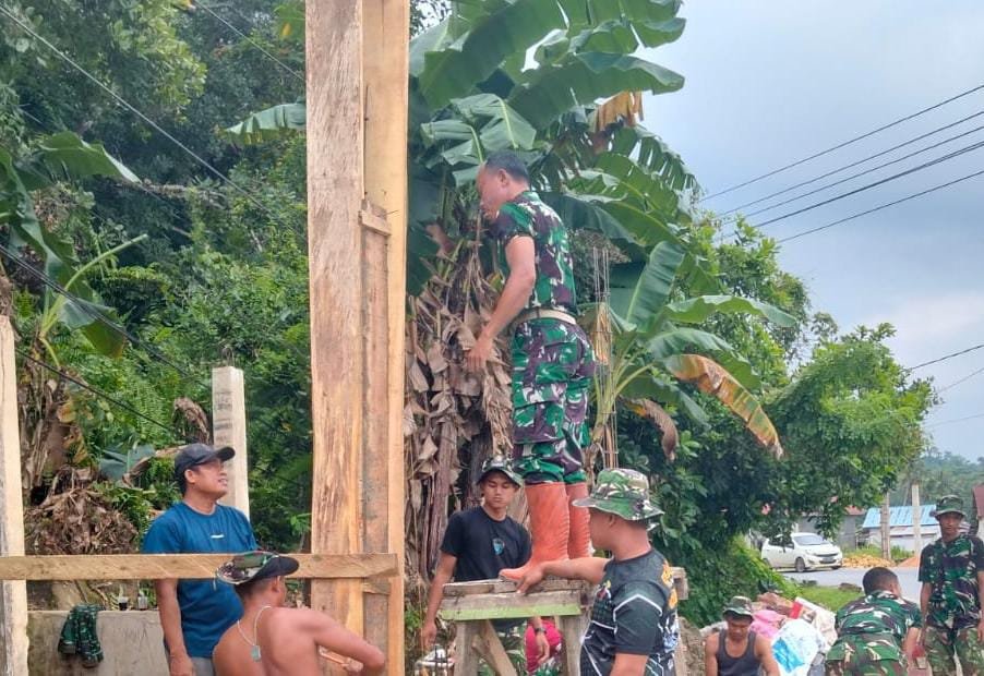 Personel Satgas bekerja sama dengan masyarakat setempat untuk memasang tiang mal, yang merupakan langkah awal dalam pembangunan fasilitas Mandi, Cuci, dan Kakus (MCK). Kegiatan ini dilakukan dengan hati-hati demi memastikan bahwa struktur yang dibangun akan stabil dan aman untuk digunakan oleh masyarakat.