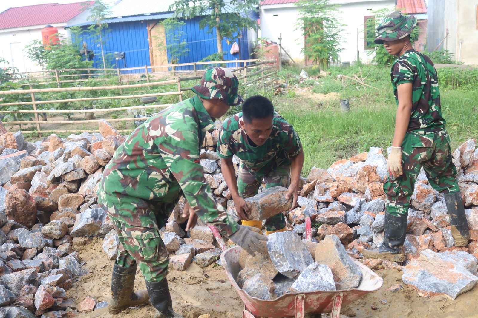 Kendari – Untuk memastikan kelancaran pembangunan talud jembatan, Satgas TMMD 127 tetap melanjutkan pekerjaan meskipun harus berjuang menghadapi medan yang licin di Kelurahan Anggoeya pada Kamis (19/2). Pendistribusian material dilakukan dengan cara gotong royong agar tidak ada kendala yang muncul di lapangan.