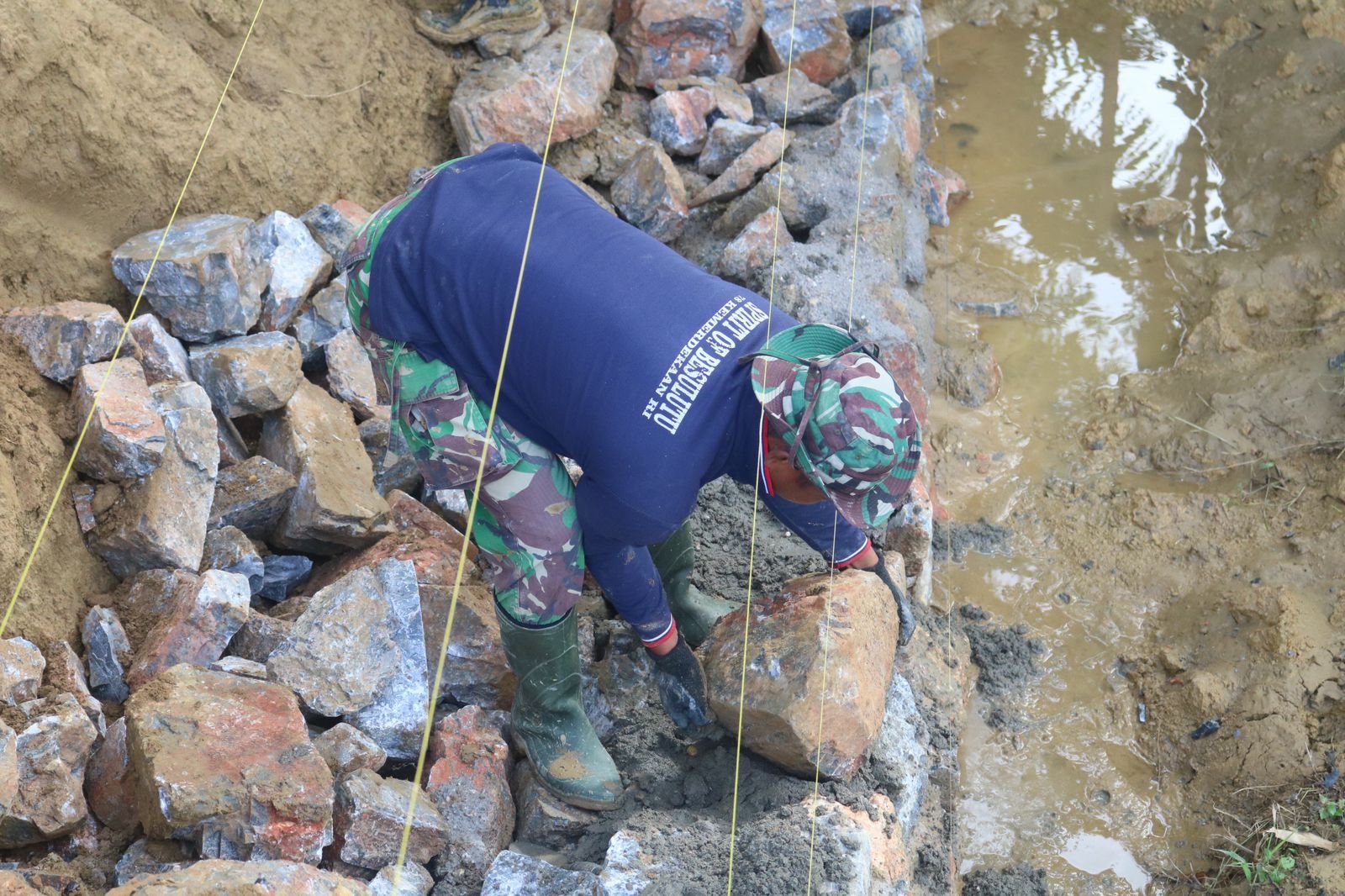 Kendari – Meskipun menghadapi medan yang licin dan berlumpur, Satgas TMMD 127 dari Kodim 1417/Kendari tetap berkomitmen untuk menyelesaikan pembangunan talud jembatan di Kelurahan Anggoeya pada Kamis (19/2). Personel satgas melaksanakan tugas dengan penuh kehati-hatian untuk memastikan distribusi material bangunan berjalan dengan baik dan efisien.