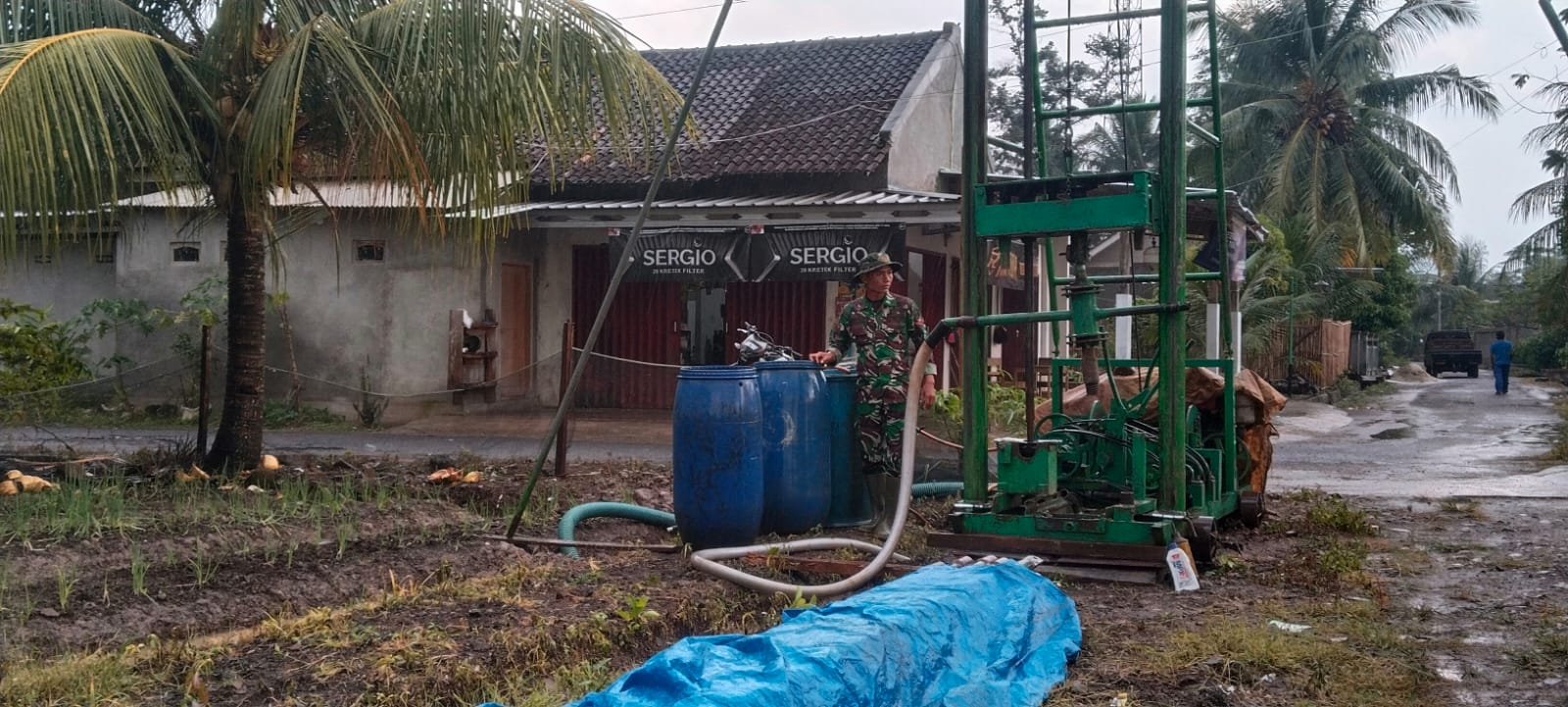 Satu titik sumur bor yang berlokasi di rumah Ibu Rumiani di Desa Tanjung Rejo sudah memasuki tahap pengeboran. Sementara itu, sumur bor lain milik Bapak Triyono masih dalam proses pemasangan alat pengeboran sebagai persiapan sebelum pekerjaan dimulai.