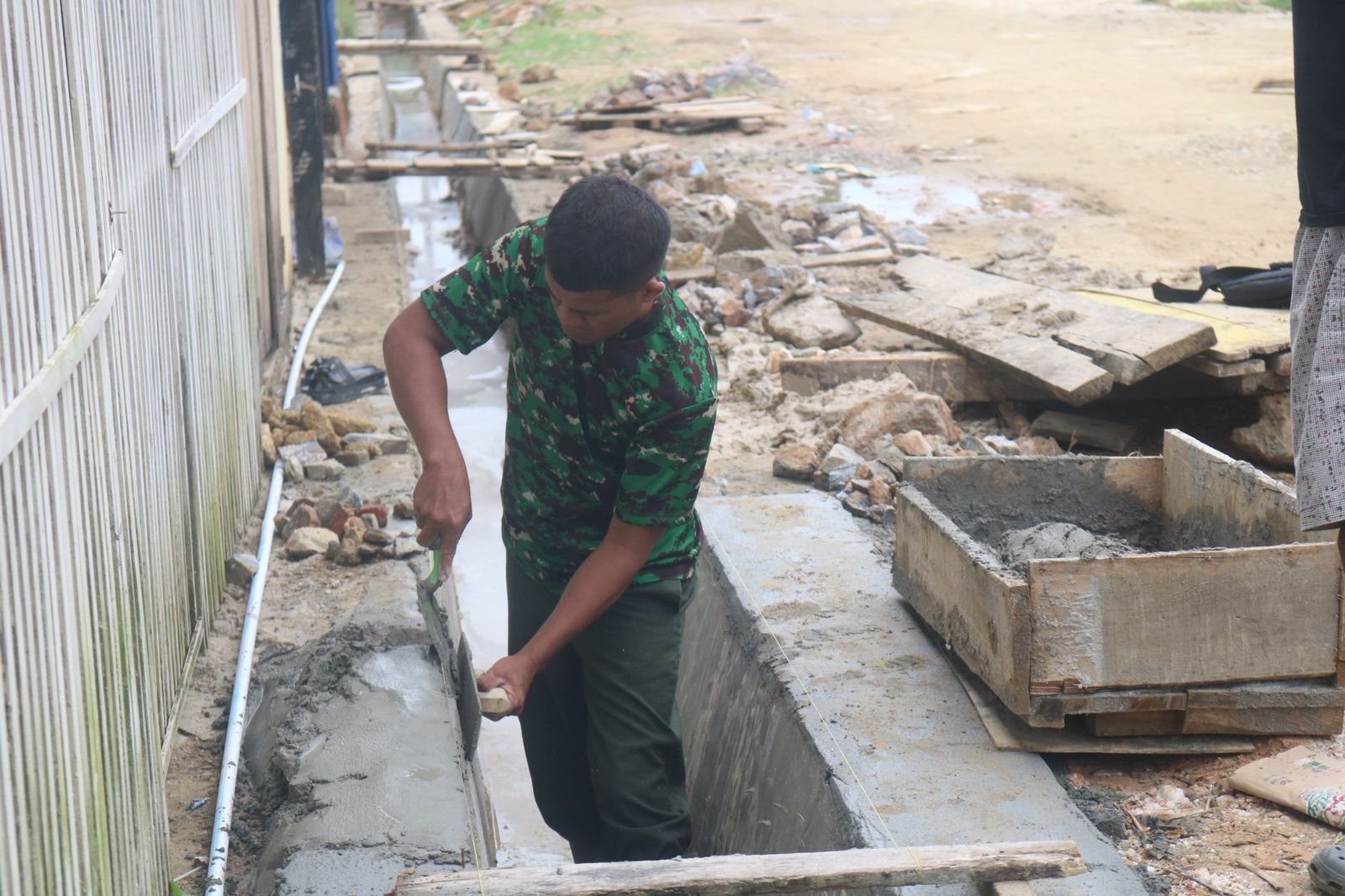 KENDARI – Anggota Satgas TMMD ke-127 dari Kodim 1417/Kendari, yang mengenakan seragam loreng berlumur semen, berkolaborasi dalam menyelesaikan pembangunan drainase di Kota Kendari pada hari Minggu (1/03). Pekerjaan ini difokuskan pada proses plesteran dinding saluran air yang dilakukan dengan teliti, guna memperkuat struktur serta melindungi dinding dari kebocoran air.