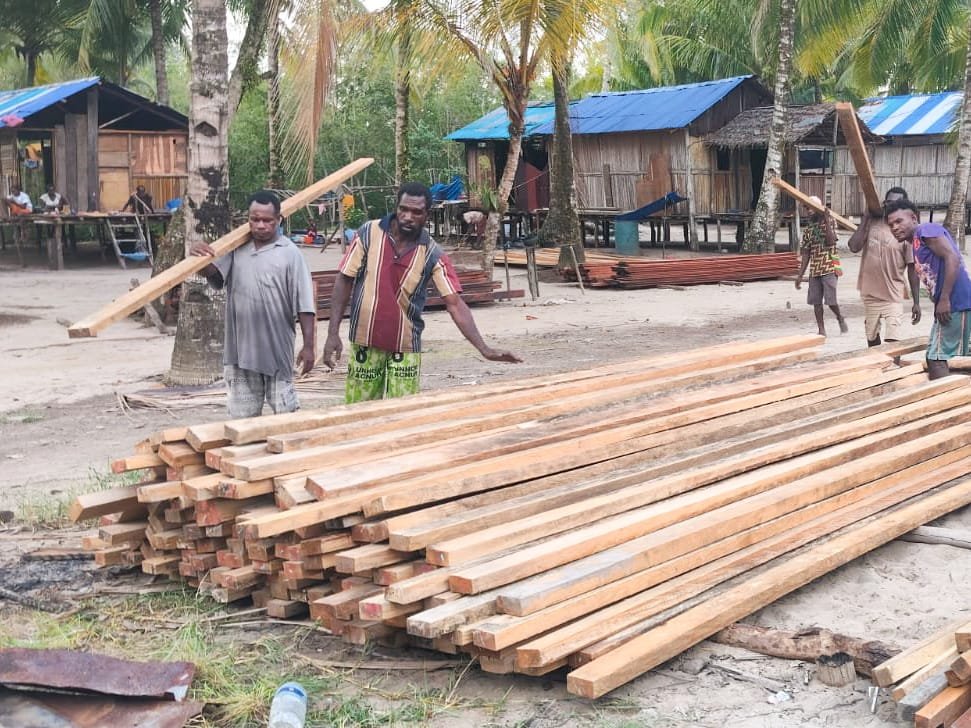 Pengangkutan material dilakukan dengan menggunakan kapal laut yang disesuaikan dengan kondisi lapangan. Metode ini menjadi pilihan utama mengingat akses darat ke kampung masih sangat terbatas.