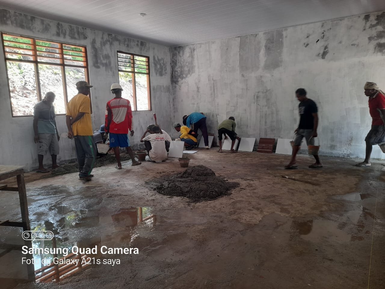 Pekerjaan ini dilakukan dengan penuh ketelitian agar lantai ruang kelas menjadi lebih kuat, nyaman, dan tahan lama. Proses pemasangan keramik juga menjadi salah satu langkah penting dalam menyempurnakan fasilitas belajar bagi para siswa.