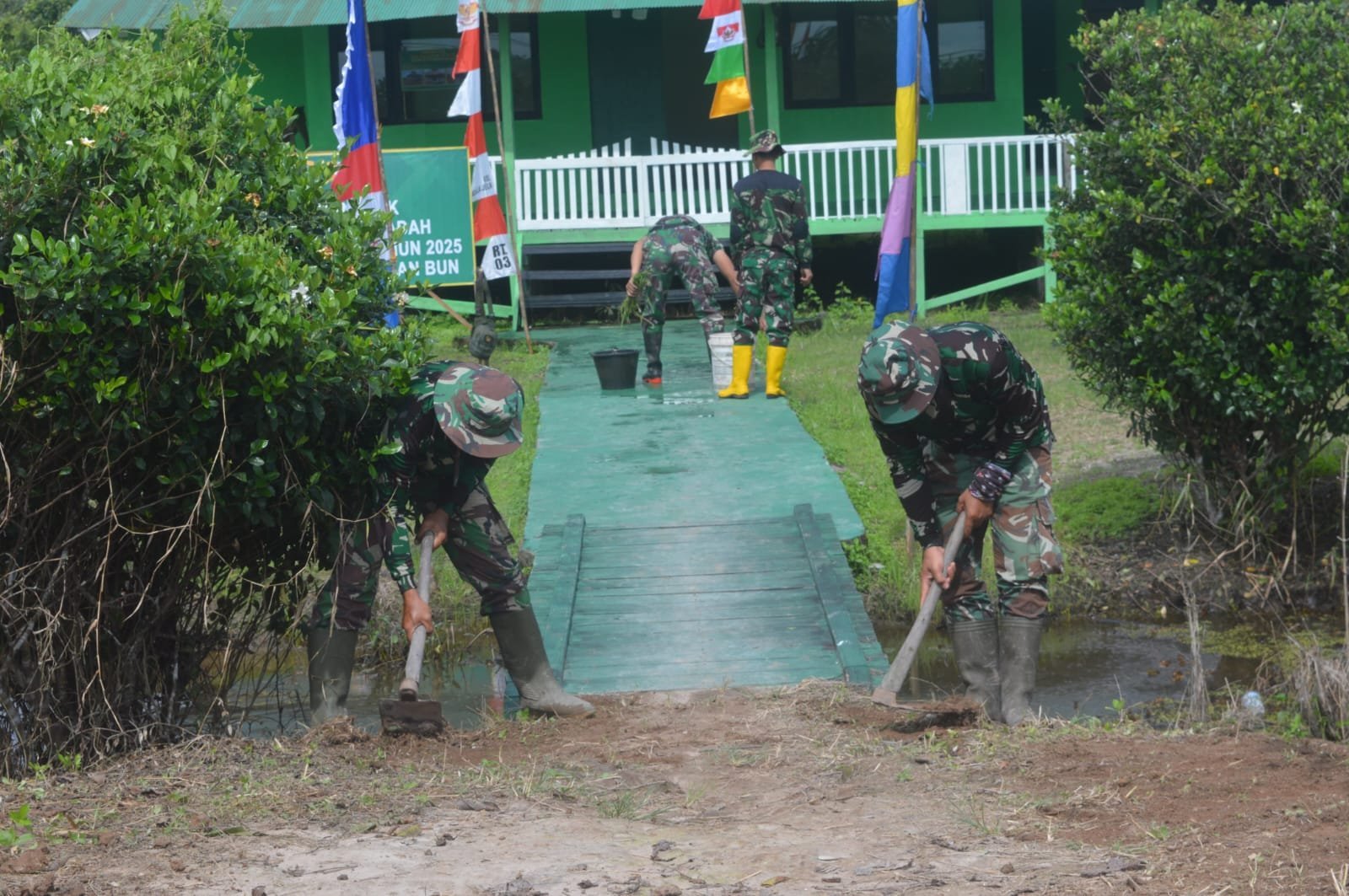 Sementara personel lainnya bersama warga melakukan perbaikan dinding belakang mushola. Sinergitas di antara warga dan personel Satgas ini membuat pengerjaan rehab musholla lebih ringan.