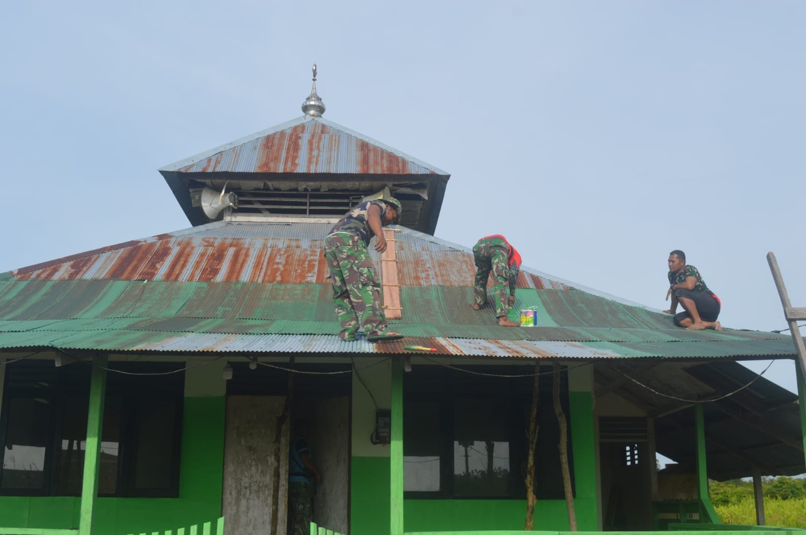 Sukamara – Program TNI Manunggal Membangun Desa (TMMD) Reguler Ke-123 Kodim 1014/Pbn terus menunjukkan progres dalam berbagai sasaran fisik maupun nonfisik. Salah satu kegiatan fisik yang dilakukan di Desa Nibung dan Desa Sungai Damar adalah pengecatan atap Musholla Babul Jannah, yang dikerjakan secara gotong royong oleh anggota Satgas TMMD bersama warga setempat, Senin (17/03/2025).